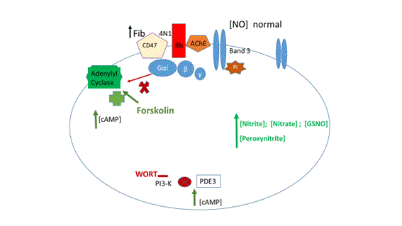 Figure 1: Representative diagram of normal NO efflux from erythrocyte in an in vitro model of hyperfibrinogenemia. Fibrinogen (Fib) binds to CD47. It was shown that the amount of NO efflux is increased at lower adenosine monophosphate (cAMP) and normalized at high cAMP levels achieved in presence of forskolin and wortamannin (WORT), respectively activator of adenylyl cyclase and inhibitor of phosphodiesterase (PDE3).