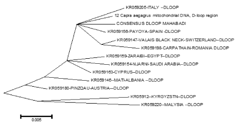 The sequences obtained were compared by alignment to the international Gene Bank data-base in Chinese (KM 360063), Switzerland (KR059147) , Italy (KR059205) , jordan (KR059160 ) , Iran (KR059191 ) , Spain (KR059156 ), Austria (KR059180) , Egypt (KR059159) , Turkey (KR059200), Cyprus (KR059163) , Saudi Arabia (KR059154), Romania(K059198), Albania (KR059146), Kyrgyzstn (KR059122) , Malysia (KR059220) and Capra aegagrus (AB004076.1 ) using the BioEdit software program version 7.2 [21]. To investigate genetic relationship between mitochondrial sequences, an unrooted neighbor-joining phylogeny [22] was constructed using the Tamura–Nei distance method [23,24-43]. The distance computation and phylogenetic tree construction are incorporated in the MEGA package version. 5.1 (Figure 2).