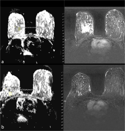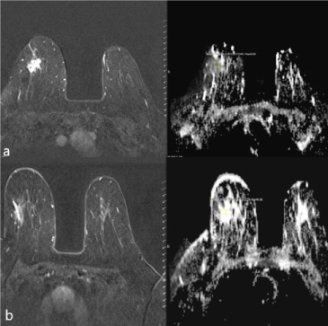 Figure 3a-b. ADC mapping and T1 weighted subtraction imaging of a 66-year-old case detected breast invasive ductal carcinoma with a mass of 22x16x19 mm with speculated contour; a) Mean ADC value before NAC was 0.72 and b) Mean ADC after NAC was 1.7.