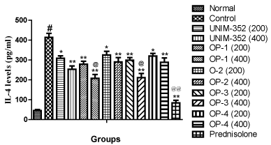 Figure 4: Effects of UNIM-352 and optimized preparations of UNIM-352 on IL-4 levels in BAL fluid of OVA immunized and challenged rats. Data are expressed as Mean ± SEM. #p< 0.01 vs normal group; *p < 0.05 and **p < 0.01 vs control group; @p < 0.05 and @@p < 0.01 vs UNIM-352 (200 mg/kg).