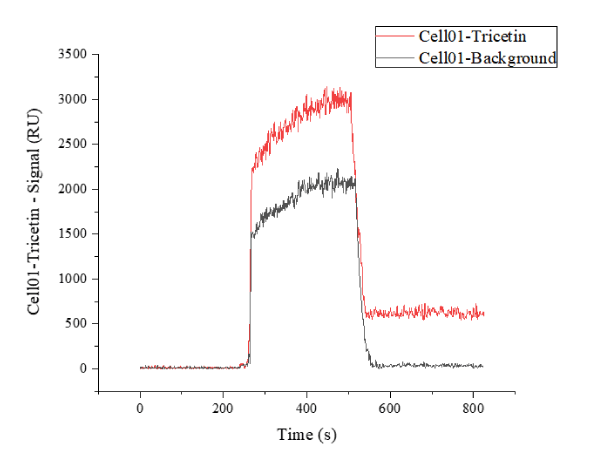 Figure 3. Tricetin spotting area signal curve (red) indicates the signal change of the compound spotting area on the chip, and the background noise signal curve (black) indicates the signal change of the unspotted area