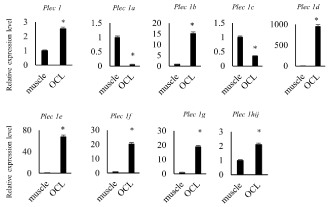 mRNA was harvested from femur muscle (described as muscle) and osteoclast like cells (described as OCL) derived from spleen cells stimulated with 30 ng/mL of M-CSF and 100 ng/mL of sRANKL for 7days. Expression level of Plectin isoforms’ mRNA was measured by quantitative RT-PCR