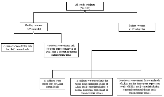 Methods: 188 subjects including 109 women with histologically confirmed endometriosis and 79 healthy women were recruited. Serum Dkk1 levels were measured by ELISA in 97 and 75 women with- and without endometriosis respectively. Gene expression levels of Dkk1- and β-catenin were assessed by quantitative polymerase chain reaction in 28 different human tissue types, including 4 normal endometrium tissues, 8 normal peritoneal tissues, and 16 endometriosis tissues.