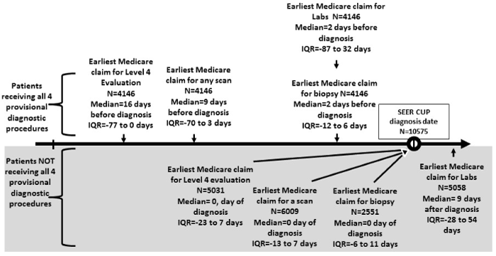 We compared the timing of the receipt of each of the four diagnostic tests among patients with and without a complete diagnostic evaluation in Figure 1. The figure is divided into top and bottom with a timeline in the center of the figure. The top half of the figure displays the median times and the interquartile ranges for patients who received a complete diagnostic evaluation (all of the four diagnostic tests). The bottom half of the figure displays the median times and the interquartile ranges for patients who did not receive a complete diagnostic evaluation. Patients receiving a complete diagnostic evaluation received each test earlier than the group of patients not receiving a complete diagnostic evaluation; P<0.01. See Figure 1.