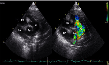 Figure 4. A large rhabdomyoma detected in the right ventricular outflow tract, very close to the pulmonary valve, responsible for mild flow acceleration without significant gradient