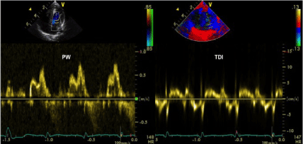 Figure 5. Anomalous mitral pattern at pulsed wave Doppler evaluation showing signs of impaired left ventricular diastolic function
