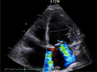 Figure 2.Transthoracic echocardiography : Apical four chamber view  showing  a functional mitral regurgitation (fMR) grade III