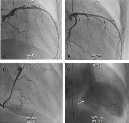 Figure 3.Coronary angiography: Left coronary artery (A+B) and the right coronary artery (C).