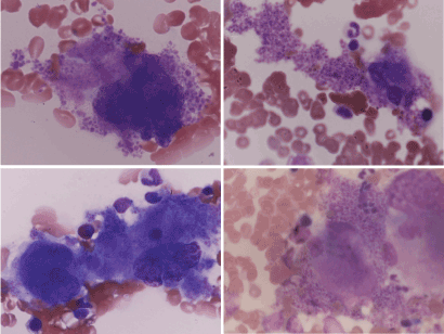In the bone marrow aspirated smear sample, we classified megakaryocytes with platelet counts seven types, especially filled and spilling out with adjacent shedding platelets as type U (Figure 1), because, megakaryocyte with filled and spilling out with adjacent shedding platelets was not observed in 25 Philadelphia positive myeloid leukemia cases ,10 polycythemia vera cases and another hematologic malignancy cases. type 0; Megakaryocytes without platelet production, type I, Platelet production; less than 10, type II; Platelet production more than 10, type III, Prominent, type IV; Extremely high platelet production and type V; naked megakaryocytic nuclei.