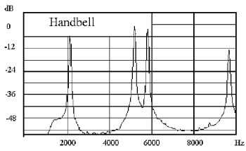 Figure 1. Spectrum of a handbell. The abscissa axis is the frequency, Hz. The ordinate axis is the sound pressure level, dB SPL