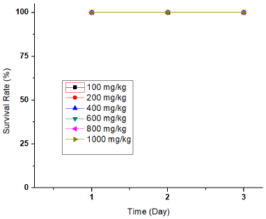 Acute toxicity test was studied to evaluate the specific dose levels that can sake of mortality. Various toxicological signs including changes in behavior, alertness, restlessness, muscle convulsion, tremor, touch response, torch response, pain response, gripping, writhing, urination, salivation, skin color, food intake, water intake and grooming, and survival analysis were regarded during 72 hours of the examination period. In conformity with the result, MEHR up to 1000mg/kg dose showed no toxicity related symptoms or mortality during the entire time of acute toxicity test. Hence, the median lethal dose (LD 50) would be more than 1000mg/kg. Here, Table 3 represents the acute toxicity test data of MEHR (100, 200, 400, 600, 800, and 1000 mg/kg) in thirty Swiss albino mice (the control group did not receive any treatment); where, “✔” and “X” signs indicate normal parameter and absent parameter respectively, and zero sign “0” means Nil.