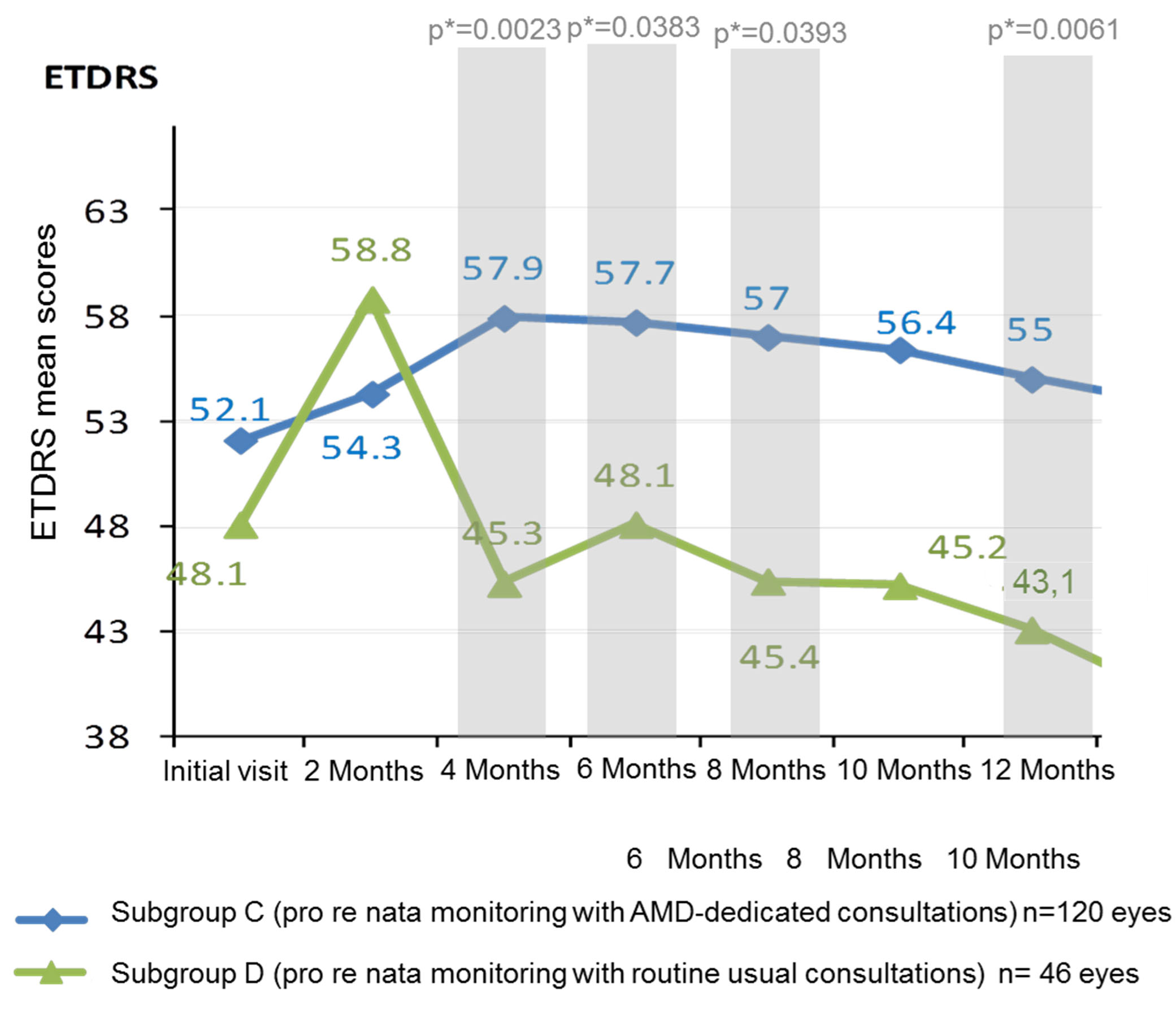 Results: Two-year analysis (n=144 patients): VA increased significantly between baseline and 6 months (p=0.0009 and p=0.0069). Induction phase did not significantly affect VA evolution (except at 6 months). Patients with induction phase had 3.5-times less chance of VA increase (p=0.0050). The initial NV type did not affect AV evolution. The ETDRS scores at 4, 6, 8 and 12 months were significantly higher with AMD-dedicated vs standard consultations (p<0.05).