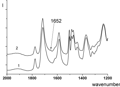 This band may be due to the formation of a C=N imine bonds. In the IR spectrum of sample, subjected heat treatment in mode c (final temperature of treatment - 250°C), this band is absent (Figure 5, curve 1). The Raman spectrum of the film heated at 300°C (heat treatment mode b) shows the carbonyl band at 1740 cm-1, and a band at 1652 cm-1 (Figure 6); the latter is ascribed to imine C=N bond [19].