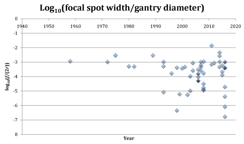 to detector width d suggests a general lack of optimization of this ratio. Ratios in review articles may not be for the same pieces of equipment, as both parameters are rarely reported together, but are included, since the measurements reviewed represent a range of possibilities. “CT” refers to any computed tomography technology, whether clinical or experimental, including tomosynthesis. The larger the ratio of focal spot width f to gantry diameter 2r (distance between the x-ray source and the detector), converted here to