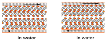 Figure (3a) shows transformation of hydrophilic bilayer to hydrophobic monolayer during drying process at room condition. A tree of ‘lamellar-repulsive mechanism’ of joints lubrication shown in Figure (3b). Surface amorphous multilayer (SAL) membrane provides the boundary lamellar-repulsive hydration lubrication. The lamellar-repulsive mechanism is supported by PL lamellar phases and charged macromolecules present in the synovial fluid between two charged cartilage surfaces.