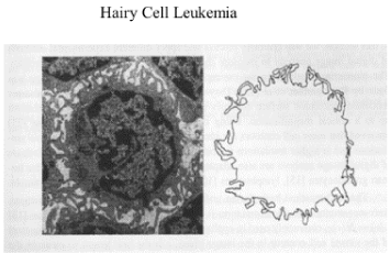 Figure 5. Electron microscopy view of an element isolated from blood with Hairy-cell leukemia, a chronic type of leukemia. A significant elevated fractal dimension of FD 1.32 characterized its membrane surface with a highly convoluted profile. Magnification 18400 X. Reproduced from Losa GA, Baumann G, Nonnenmacher Th F (1992) Path Res Pract 188: 680-86.
