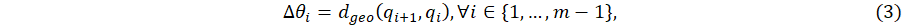 where dgeo(qi+1,qi = 2 cos-1(wi+1wi + xi+1xi + yi+1yi + zi+1zi) is the geodesic distance between two successive quaternions. Next the average angle