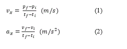 The linear kinematic information of the lower body’s joints motion in the horizontal direction is calculated by dividing the changes of position (final position minus initial position, i.e.: Pf — Pi ) by the changes of time (final time minus initial time i.e.: ) to calculate linear velocity, while the linear acceleration is calculated by dividing the changes of velocity to the changes of time for hips, knees, and ankles, as can be seen in Eq. (1) and Eq. (2).