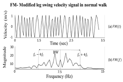 The second method is used for extracting two gait features by modifying the leg swing velocity signal using the FM technique. The modified leg velocity signal is represented in time domain to extract the frequency deviation (±∆f), which yields two new frequencies that differ from original frequency of the reference signal (fr ) to produce new frequencies, i.e.:
