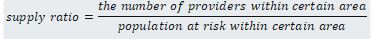 Several measures of geographical determinants of health have been proposed. One of the simplest measures is the provider-to-population ratio, also called supply ratio. This measure is intuitive and the easiest to understand, and corresponds to “availability” which is a subordinate concept of “access.”