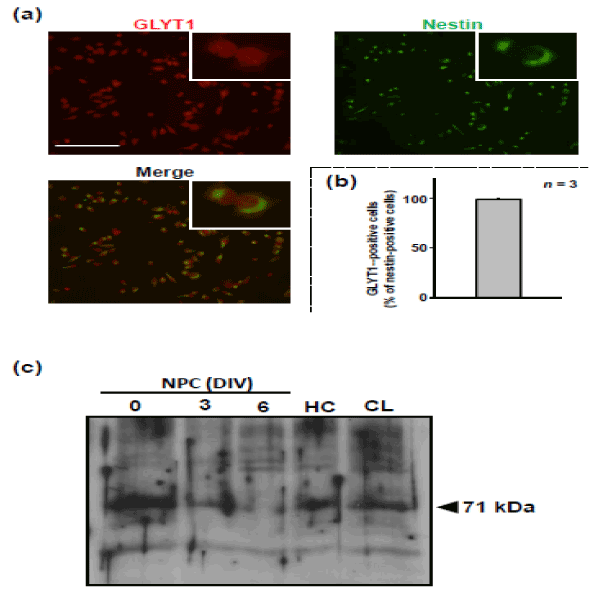 Figure 1: Expression of GLYT1 in NPC cultures. Cells were isolated from embryonic mouse hippocampus and then cultured in the growth medium for 9 DIV. At 9 DIV, the cells were harvested and dispersed for replating on dishes that had been previously coated with poly-L-lysine. (a) After having been incubated in the growth medium for 1 h, the cells were fixed for double-immunostaining for GLYT1 (red) and nestin (green). (b) The graph shows proportion of GLYT1 (+) cells in nestin (+) cells. Values are expressed mean ± S.E. from 3 independent experiments. (c) Cells were harvested for subsequent replating and culturing in the growth medium for 6 DIV. As positive controls, tissue lysates of hippocampus (HC) and cerebellum (CL) were prepared from the adult mouse brain. Cell lysates obtained were then subjected to immunoblot analysis for GLYT1. These experiments were carried out with at least three independent experiments under the same experimental conditions, with similar results.