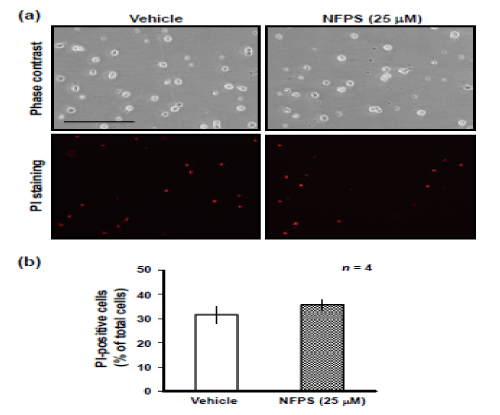 Figure 3: Propidium iodide (PI) uptake assay. The extent and distribution of dying cells were determined after replaced cells for 1 DIV by the addition of PI at a final concentration of 2 mg/mL into the growth medium. The amount cell death was determined by using a fluorescence microscope and camera after 10 min of incubation at 37ºC. (a) Typical micrographs of the cells in either the presence or absence of NFPS. PI staining revealed that NFPS had no significant effect on cell viability in cultured NPCs for 1 DIV. (b) The graph shows proportion of PI (+) cells in total cells. Values are expressed mean ± S.E. from 4 independent experiments.