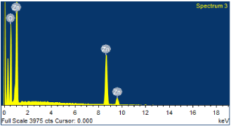 FTIR spectroscopy was used to confirm the surface groups of the nanoparticles qualitatively with spectra recorded by a Perkin-Elmer model FTIR spectrophotometer. The mean particle diameter of zinc nanoparticles was calculated from the XRD pattern rendering to the line width of the plane, refraction peak using Debye–Scherrer equation. SEM analysis was carried out to understand the topology and the size of the ZnO-NPs, which showed the synthesis of higher density polydispersed spherical ZnO-NPs of spherical shape of 39.94 nm sizes. While the presence of metals in the sample was analysed by EDX.