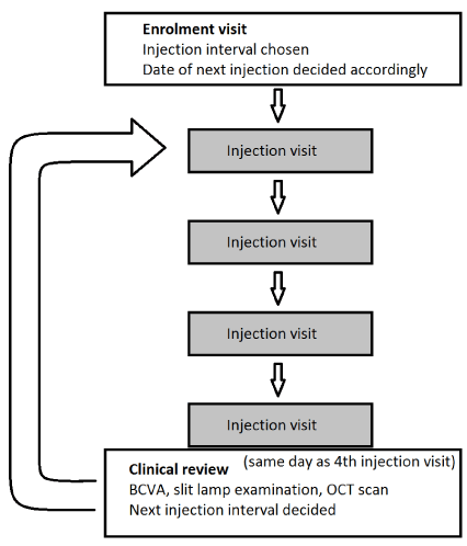 In order to determine the treatment interval, the number of weeks between the patients’ most recent two injections on the PRN regimen was calculated. If there was no oedema prior to the last injection, this became the patient’s injection intervalfor the next four injections. If there was oedema prior to the last injection, the shortest interval between injections in the last six months that resulted in exudation was calculated and two weeks subtracted to determine the patient’s injection interval. Injection interval could be set at a minimum of 4 and maximum of 12 weeks. Patients received a clinical review at the time of the fourth injection. If the macula was dry, the injection intervalwas extended by 2 weeks. In the presence of macular oedema, the injection interval was reduced by two weeks. This was repeated cyclically for a total of one year.