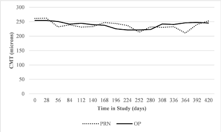 Figure 3. Trend of mean CMT (microns) shown at 4 week intervals over the course of the study under both the PRN and O&P regimes