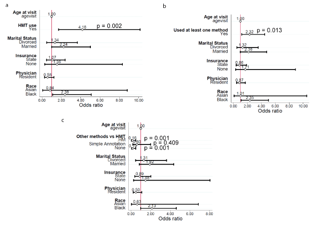 Controlling for age, marital status, insurance type, race, and physician level in the model, use of .HM was associated with 84% reduced odds of completing cervical cancer screening compared to HMT use (OR = 0.16, 95% CI = [0.049, 0.500], p-value = 0.001) (Figure 2c). Not using any reminder systems was associated with 81% reduced odds of cervical cancer screening completion compared to HMT use (OR = 0.19, 95% CI = [0.072, 0.488], p-value = 0.001) (Figure 2c). While simple annotation was associated with 40% reduction in odds of completing cervical cancer screening compared to HMT use, the association was not statistically significant (OR = 0.60, 95%, p-value = 0.409).