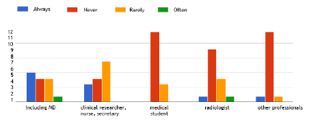 For the DeNaCaPST programme, medical software was developed with the aim of helping professionals and to allow for the sharing of medical information between several doctors. Actually, the main user is the MD who includes the patient (Figure 2). When taking into account just centres who have already included patients, they all found it useful, i.e. very to moderately useful to create a summary of the history of cancer in their patients, in 66.7% and 33.3% of centres, respectively, and to create a personalised long-term follow-up plan in 50% and 50% of centres, respectively. Perspectives concerning this software developed with a group of MD, researchers and patient associations include personal reminders to the MD and the CAYACS and dedicated access for the CAYACS to their medical information; 57.1% of the 14 MD who participated to this survey found that this is an important and useful perspective, but 28.6% answered that they do not have the time to use this tool. The remainder had no specific opinion.