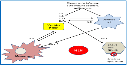 HLH is not a malignant disorder. It is a severe inflammatory syndrome associated with a major immune dysfunction defined by the absence of down-regulation of abnormally activated lymphocytes leading to tissue destruction by phagocytosis. The tissue damage will result in further cytokine release that keeps the vicious circle of macrophage activation and paralyzes the cytotoxic T cells and NK cells. There is a high level of interferon gamma (IFN ϒ), tumor necrosis factor alpha (TNF α), soluble receptor of Interleukin (IL) 2 or CD25, IL-6 and IL-10. The pathophysiology is resumed in the Figure 2 [4-6].