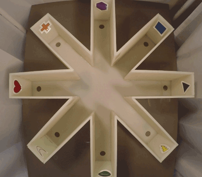 Figure 3. Radial Arm Maze Set Up. 8 Arms each with a unique symbol at the end.  A hole at the end contains the bait