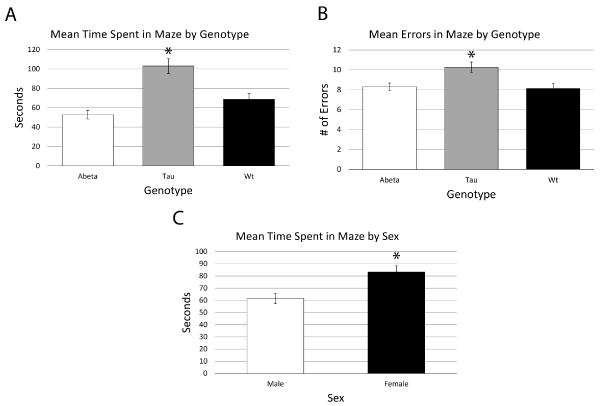Figure 4. A) Mean time spent in the maze by genotype for mice. B) Mean Errors in maze by genotype for mice. C) Mean time spent in the maze by sex