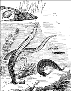 Figure 3. The Mediterranean medicinal leech (Hirudo verbana Carena 1820) in its natural habitat. Note that the cocoons are deposited in moist soil on land (adapted from an anonymous drawing, ca. 1920).