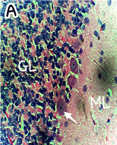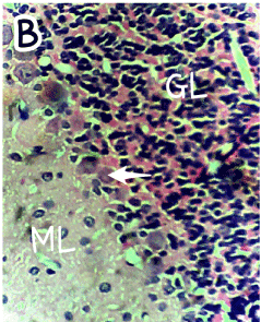 Figure 1. Photomicrograph of the histology of the cerebellum of the Control group (A) showing the three cerebellar cortical layers; molecular layer (ML), granular layer (GL), and the single-line Purkinje cells (arrow). Within the molecular layer the basket and stellate neuronal cells are well shown. No apparent abnormality is seen. H & E ×400