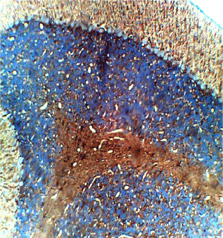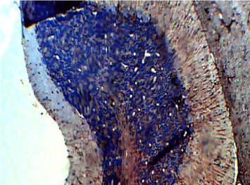 The photomicrograph of the slides obtained from each group is shown in Figures 1 and 2 for H&E and Figures 3 and 4 for GFAP immunohistochemical method. H/E staining showed perturbations in the cerebellum of the group B rats (Figure 2) with shrunken purkinje cells and distorted molecular layer. In general, the cells of the group B (Figure 2) rats were smaller compared to group A (Figure 1). GFAP Immunohistochemical staining also showed high expression of GFAP in the cerebellum of group B (Figure 4) rats compared to group A (Figure 3) rats.