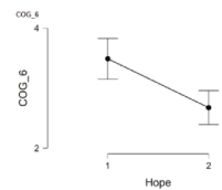 In order to make comparisons of cognition across different levels of hope, hopefulness was converted to a binary construct where Group 1 consists of women who responded to the hopefulness item with strongly disagree, disagree, or neither agree nor disagree, and Group 2 consists of women who responded to the hopefulness item with agree or strongly agree. Thus, Group 1 can be considered women with low hopefulness, and Group 2 can be considered women with high hopefulness.