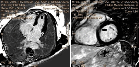 Figure 4. CMR findings that showed a spot of microvascular obstruction (MVO) in anteroseptal and apical wall.