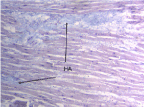 Figure 5. Interstitial space between cardiomyocytes showing hyaluronic acid (HA), stained in pale blue with Alcian blue stain (adult human heart)