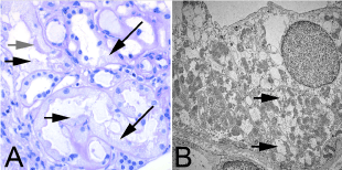 Figure 2. Histology of the kidney biopsy: A. Light microscopically potentially reversible tubule damage with defects (short black arrows) of the brush border typical for proximal tubules (grey arrow) and vacuumization of the cytoplasm of both proximal (lower black arrow) and distal tubules (upper black arrow). Periodic acid-ship paraffin histology, original magnification x 400