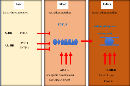 FGF23 overproduction in oncogenic osteomalacia or intravenous iron therapy or Mc Cune Albright |