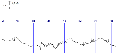 Figure 2. Electromyogram of the sigmoid colon of patients with the IBS-like syndrome in the ulcerative colitis. Scale horizontal 4 s, vertical - 0,2 mV.