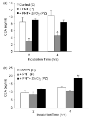 Figure 4. Effect of PNT, an inhibitor of GPI-PLD, on the release of carcinogenic ambrionic antigen in the culture medium of Ls-180 cells. The cells were cultured in 4-bed plates until the sub-confluency stage, and then 2 μg / ml PNT (P) or 2 μg / ml PNT plus Mn 5/12 ZnCl2 (p + z) into a medium lacking (a) and having B) My serum was added. As stated in Section 2, the amount of CEA released in the environment was measured. The environment of the cells that were not subjected to any chemical was used as control. The results are presented as a mean and standard error of two independent tests. The statistical differences between the two groups were calculated using the Tukey HSD test. (A) * significant P-value vs. C, significant P-value vs. C and PZ **, (b) * PZ significant P-value vs. ** significant P-value vs. C and P.