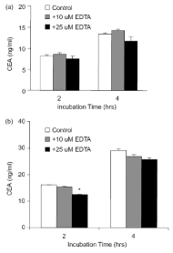 Figure 5. Effect of EDTA on the release of carcinoma embryonic antigen in the culture medium of Ls-180 cells. The cells were cultured in a 6-cm plates for sub-confluency, and then 10 and 25 EDTA were added in 2 ml of medium (a) and serum (b) was added. The amount of released CEA as measured in the text was measured. The environment of the cells that were not subjected to any chemical was used as control. The results are presented as a mean and standard error of two independent tests. The statistical differences between the two groups were calculated using the Tukey HSD test.