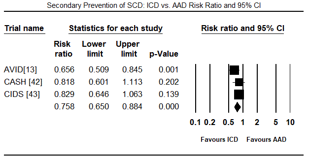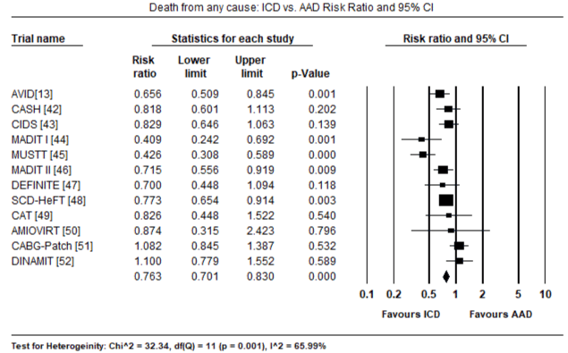 The primary treatment aim of ICD therapy is prophylaxis for SCD. Thus, many clinical trials on treatment efficacy of ICD therapy usually evaluate its effect on mortality rate, an in most cases, compared to conventional antiarrhythmic therapy or placebo. Mortality rate evaluated can be death from any cause or deaths due to cardiac or arrhythmic causes. To determine effect sizes of ICD therapy on mortality, we performed a pooled analysis of large-scale prospective multicentre trials comparing ICD therapy with conventional antiarrhythmic therapy (AAD) therapy or placebo.
