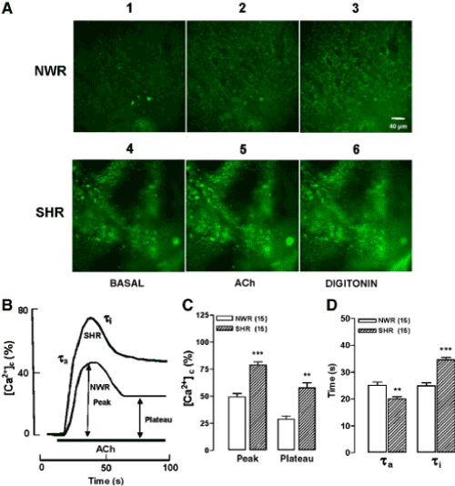 Figure 1. ACh-stimulated [Ca2+]c elevations were faster and higher in adrenal slices of spontaneously hypertensive rats (SHR), as compared with its respective normotensive control rats (NWR). Slices were loaded with Fura-2AM and were continuously perifused with an oxygenated (95% O2 and 5% CO2) Tyrode solution containing 1.8 mM Ca2+. Slices were stimulated with cholinergic agonist ACh (100 μM) for 80 s. A. Digital images showing the Fura-2 fluorescence under basal, ACh, or digitonin treatment conditions (panels 1, 2 and 3 for NWR and 4, 5 and 6 for SHR slices). B. Typical records representing the fluorescence of Fura-2 (R340nm/380nm, normalized as % of maximal fluorescence) in NWR and SHR slices stimulated with ACh (bottom horizontal bar). C. Averaged results from 15 NWR and SHR slices. D. Time constants for activation (τa) and inactivation to a plateau (τi) of the [Ca2+]c transients. The parameters plotted in C and D were calculated from experiments of the type shown in panel B. Data are means ± SEM, showing differences for SHR (*P < 0.05 and ***P < 0.001) compared with NWR. Extracted from Miranda-Ferreira et al. [19].