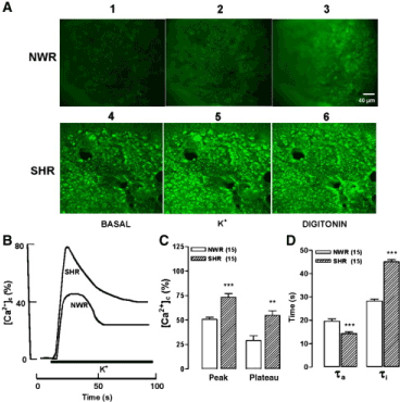 Figure 2. Stimulation with a high-K+ solution produced [Ca2+]c elevations that were faster and higher in adrenal slices of SHR, as compared with NWR. After a 5-min pre-equilibration period, slices were challenged with 70 mM K+ during 80 s. A. Digital images showing the Fura-2 fluorescence under basal, K+, or digitonin treatment conditions for NWR (panels 1, 2 and 3) and SHRs (panels 4, 5 and 6). B. Typical records representing the time course of Fura-2 fluorescence of (R340/380, normalized as % of maximal fluorescence) in NWR and SHR slices stimulated with K+ during the time period shown by the bottom horizontal bar. C. Averaged results from 15 NWR and 15 SHR slices. D. Time constants for activation (τa) and inactivation to a plateau (τi) of the [Ca2+]c transients. The parameters plotted in C and D were calculated in each individual slice, from traces similar to those shown in panel B. Data are means ± SEM for SHR, showing differences (**P < 0.01, ***P < 0.001) with respect to NWR. Extracted from Miranda-Ferreira et al. [19].