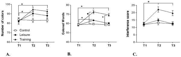 In the Stroop test, which requires effortful attention or controlled processing to perform correctly, executive control mechanisms are engaged (for review see [36]) and the inhibition required to deliberately stop a response that is relatively automatic is needed. In the present study, Training subjects were more resistant to interference than the other groups (Figure 2) and they were more able to inhibit irrelevant stimuli. Note that in the Leisure group, the interference score was not improved after the training period. Taken together, these results indicated that practicing leisure-type cognitive activities was not sufficient to improve the highly controlled process that is resistant to interference.