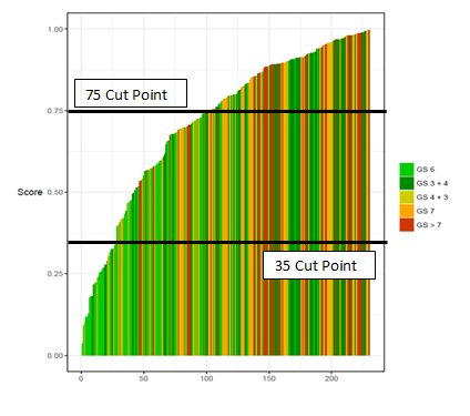 When a patient’s score is below the cut point, there is a decreased likelihood of high-grade prostate cancer. Scores below 35 demonstrated a 3.9% false negative rate for aggressive disease (Gleason 7+). Of these six (6) patients whose cancers were missed, a sub-analysis revealed five were Gleason 7 (3+4) and only one was Gleason 7 (4+3).
